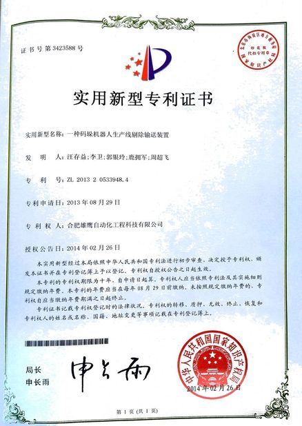 มาตรฐาน:Ptent หมายเลข:3424441 วันที่ออก:2014-02-26 ขอบเขต/ระยะ:Palletizing conveyor ออกโดย:China Intellectual Property Office |